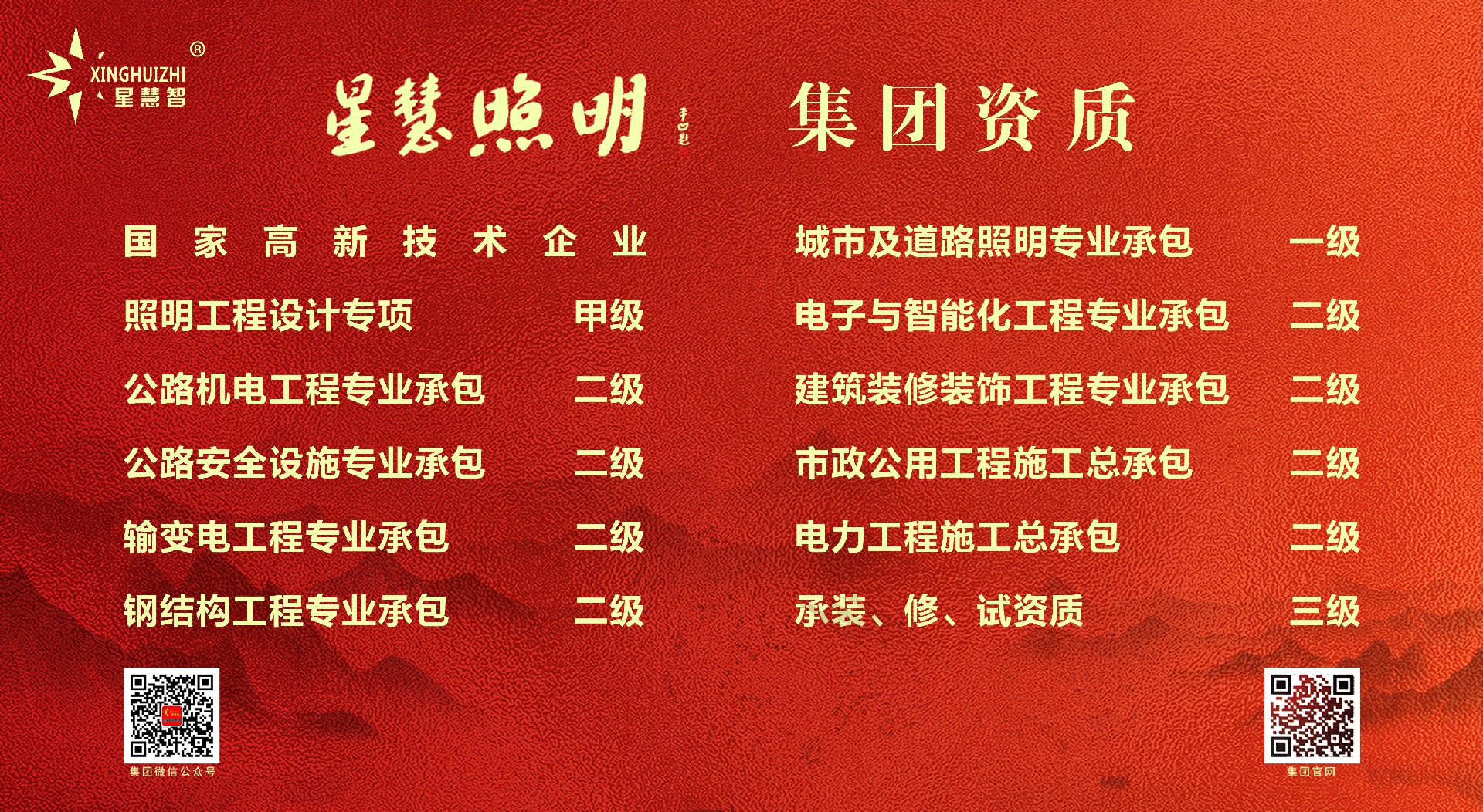 星慧照明工程集團有限公司坐落在中國路燈制造基地:江蘇省高郵市送橋鎮天山工業園區星揚路。公司成立于1999年,注冊資金5058萬元,廠區占地8萬多平方米,建筑面積6.5萬多平方米,主要下轄三大功能生產廠區和兩處商務運營中心及集團行政總部,是一家集科研、設計、生產、銷售、施工服務為一體的大型戶外照明產品制造商和集成運營商。星慧照明工程集團資質實力雄厚,目前擁有“城市及道路照明專業承包一級資質”、“照明工程設計專項甲級資質”、“電子與智能化工程專業承包二級資質”、“公路安全設施專業承包二級資質”、“公路機電工程專業分項承包二級資質”、“建筑裝修裝飾工程專業承包二級資質”、“市政公用工程施工總承包二級資質”、“鋼結構工程專業承包二級資質”、“電力工程施工總承包二級資質”、“輸變電工程專業承包二級資質”、“承裝(修、試)”三級資質。公司榮幸被評為省重合同守信用企業、省質量信得過企業、AAA級資信企業,并成功通過ISO9001:2015質量體系認證、ISO14001:2015環境體系認證、“CE”認證及“CCC”及“CQC”國家強制性產品認證、中國節能產品認證。公司成立江蘇省研究生工作站,并先后榮獲江蘇省名牌產品、省著名商標、高郵市市長質量獎、揚州市百強民營企業等榮譽證書,被江蘇省認定為企業技術中心,并順利通過安全生產標準化二級企業驗收并取得證書,為企業的跨越性發展打下健康穩健的基礎!集團公司的產品主要包括:智慧